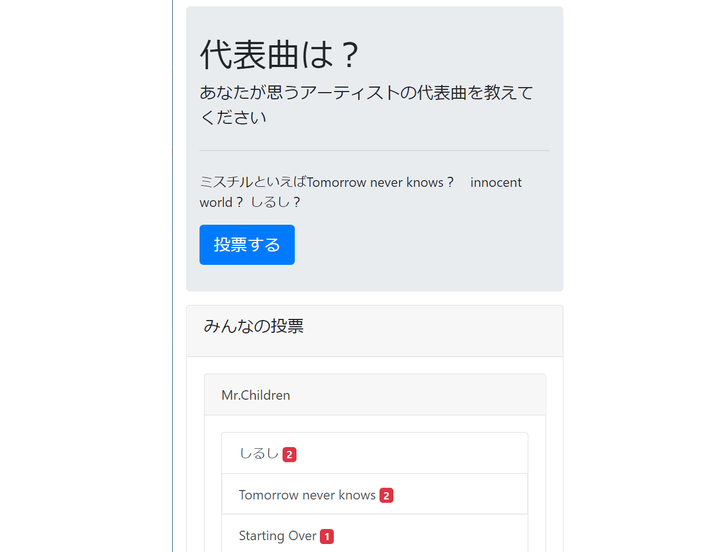 いろんな有名アーティストの一番人気な曲を投票できるサイトを作りました。 投稿画面はFirebase と React/TypeScriptでSPAです。 結果画面はFirebase と Cloud FunctionsでSSRしています。 Cloud Functionsは遅いのですが、CDNを上手に使うことで大体のページは高速にロードできるようになっています。 一番工夫したところはアイキャッチ画像(Twitterに投稿したときなどに表示される画像)の自動生成です。