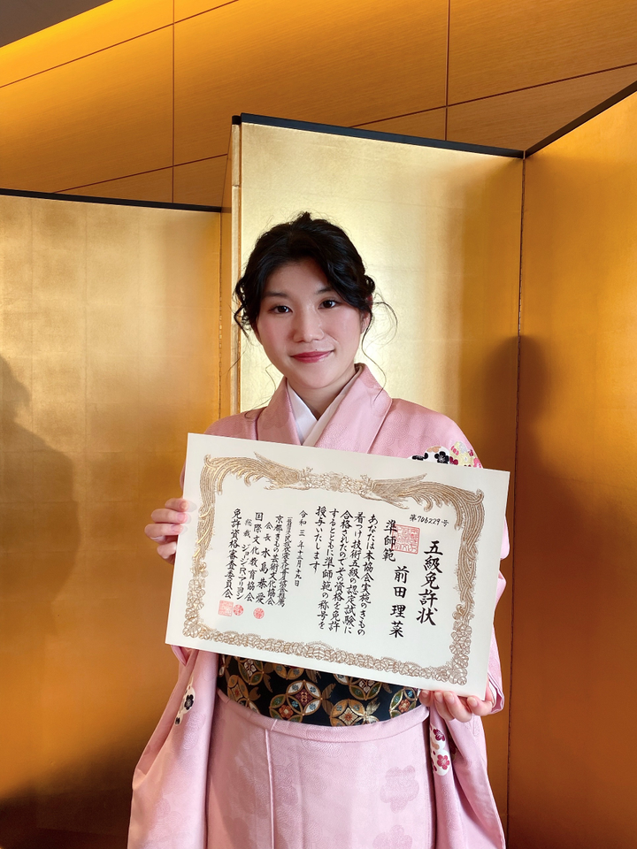 着付け教室に通い、「準師範」の資格を獲得いたしました。 普段のお作法やマナーなども身につき、様々な方とのコミュニケーションの際に役立てております。日本の伝統文化のあり方や、地域での着物の発祥の意味などを考える良い機会となっています。