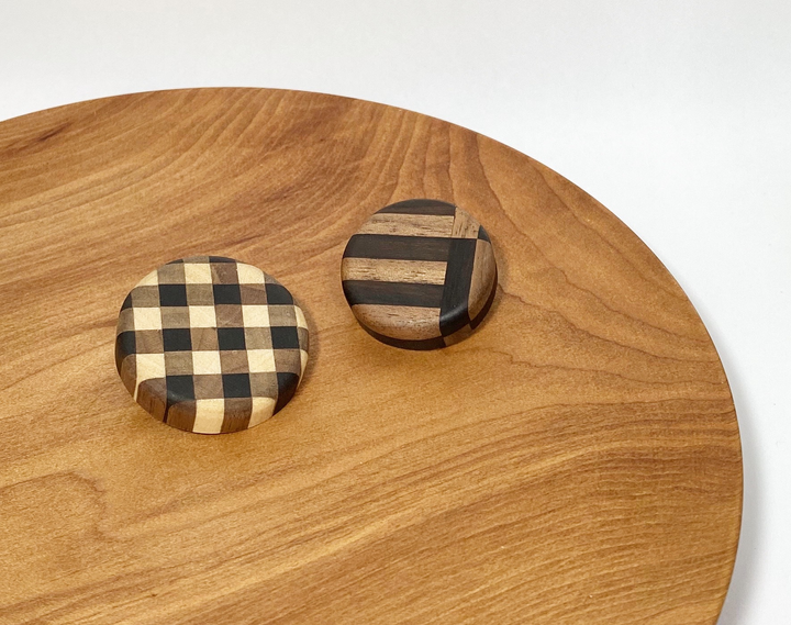 シンプルな服を華やかにするブローチです。 寄木細工の技法で制作しました。 素材:左…シナ、ウォルナット、コクタン 右…ウォルナット、コクタン