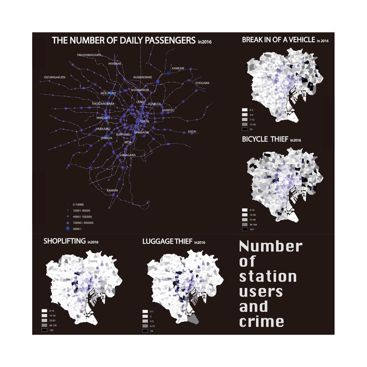 Number of station users and crime 東京都23区内の駅の1日乗車数と犯罪件数を重ねたインフォグラフィック。