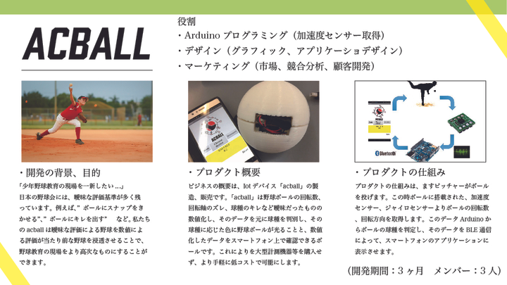 【言語・フレームワーク等】 Arduino 【概要】 野球ボールの回転方向、角度、軌道のデータをセンサーで取得し、ピッチングの向上をアシストするスマートボールの開発。 【個人の役割に関する詳細】 Arduinoを使用して加速度センサーからアナログ値を取得し、球種の判定に使用しました。IllustratorとPhotoshopを使用しロゴやアプリのUIを設計しました。リーンスタートアップに基づき、顧客の課題やニーズなどの仮説をたて、検証を行いました。 【創意工夫・苦労した点・今後の展望等】 マルチタスクをこなすためにプロジェクトのマネジメントを行ったことです。具体的には作業を全て書き出し、優先順位、作業推測時間を決めて管理しました。
