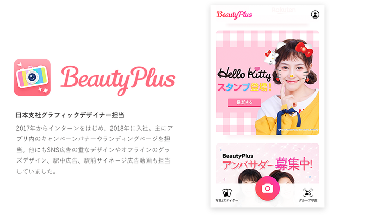 カメラアプリBeautyplusのデザイナーを担当していました。 アプリ内バナーデザインからランディングページ、広告動画、オフライングッズデザインなどを担当。 URLの公式インスタグラムの画像はほぼ私が制作しているのでご覧ください。