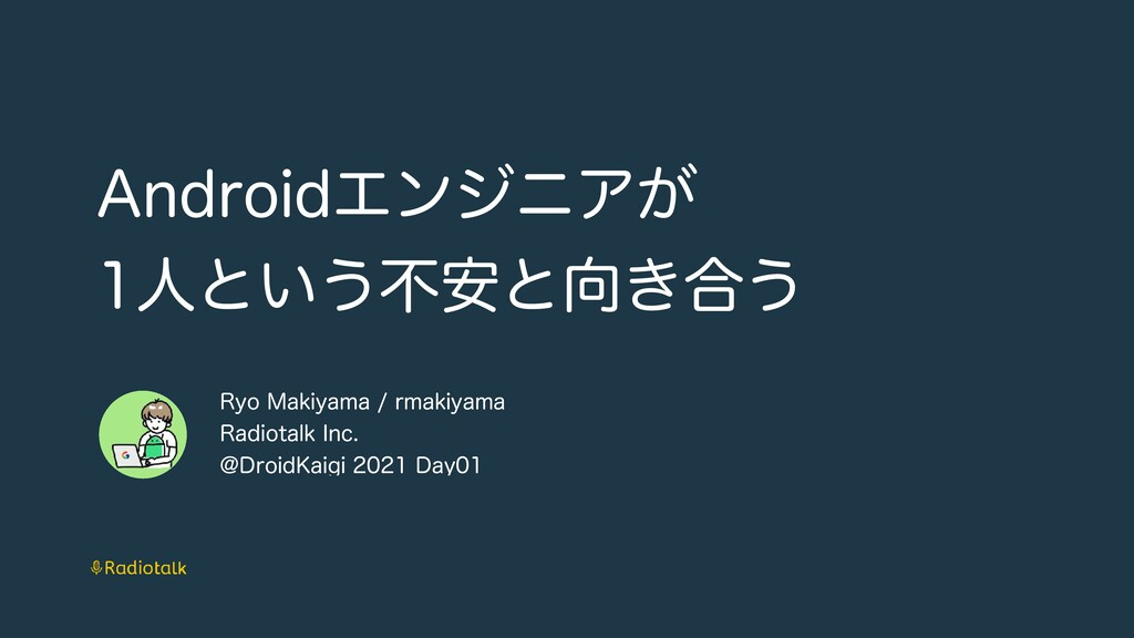 DroidKaigi 2021で発表した内容です。 ▼動画URL https://youtu.be/5M0xJLdAcAE --- Androidエンジニア不足が叫ばれる昨今、1つのAndroidアプリに対して1人のAndroidエンジニアという状況が増えてきているように感じています。このような状況下では、スキル面・キャアリア面での不安を持つ方も多いのではないでしょうか。牧山のキャリアとしても、ほとんどがチームにAndroidエンジニアが1人という経歴です。 本セッションでは、その経験を踏まえ、牧山自身が抱えてきた不安を元に、その不安に向き合うためにやったこと・やっていることについて話します。