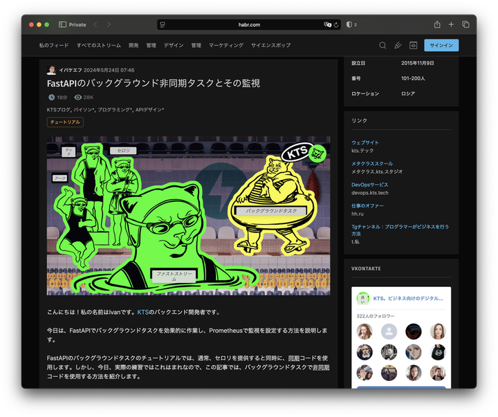 FastAPIの非同期バックグラウンドタスク処理について開発者と密に連携し、各種ライブラリ(ARQ、SAQ、FastStream、Celery)やPrometheusによる監視方法を調査・分析しました。最新の非同期パターンを正確かつ実用的に解説し、開発者ブランドの向上に貢献しました。