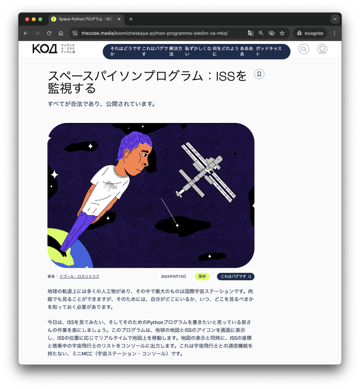 Pythonを使って国際宇宙ステーション(ISS)の現在地を表示するミニアプリを開発し、その解説記事を執筆。オープンソースコードを元に改良を加え、全行にコメントを付けて読者が理解しやすい構成に仕上げました。