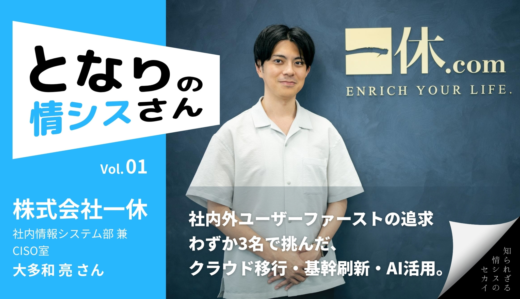 2015年に新卒で入社した大手企業の情報システム部門で社内 SE としてキャリアをスタート。基幹システムの保守運用・開発に携わった後、2018年に株式会社一休(LINEヤフーグループ)に入社。ヘルプデスク業務からコーポレートエンジニアとしての SaaS・クラウドサービスを中心としたシステム企画・開発や、本社オフィスの移転といった全社的なプロジェクト推進まで幅広く担当。2022年からは CISO室を兼任し、情報セキュリティ、データプライバシー領域も管轄。