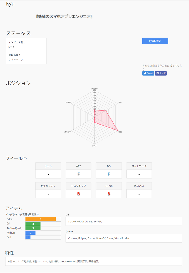 ITエンジニアのスキルを可視化することでITエンジニアと企業や仕事のミスマッチを無くす。 スキルを可視化は経歴を入力するだけ。