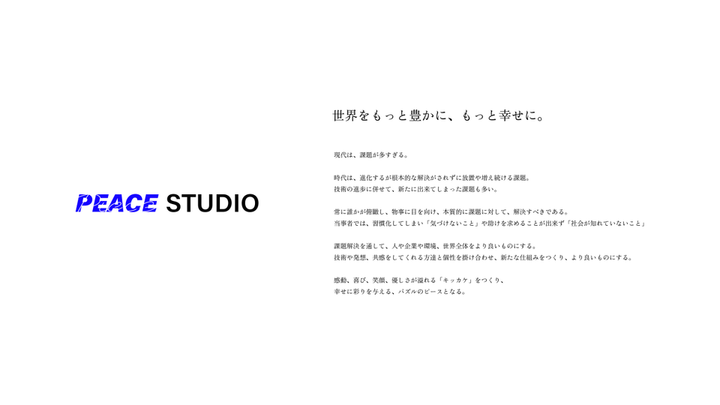 「世界をもっと豊かに、もっと幸せに。」 現代は、課題が多すぎる。 時代は、進化するが根本的な解決がされずに放置や増え続ける課題。 技術の進歩に併せて、新たに出来てしまった課題も多い。 常に誰かが俯瞰し、物事に目を向け、本質的に課題に対して、解決すべきである。 当事者では、習慣化してしまい「気づけないこと」や助けを求めることが出来ず「社会が知れていないこと」 課題解決を通して、人や企業や環境、世界全体をより良いものにする。 技術や発想、共感をしてくれる方達と個性を掛け合わせ、新たな仕組みをつくり、より良いものにする。 感動、喜び、笑顔、優しさが溢れる「キッカケ」をつくり、 幸せに彩りを与える、パズルのピースとなる。