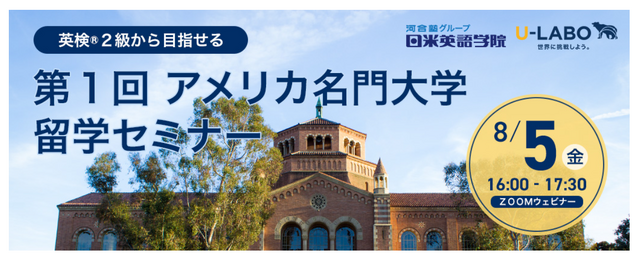 世界トップ大学に特化した進学サポートを行う株式会社U-LABO(本社:東京都新宿区、代表取締役社長:小泉涼輔、以下「U-LABO」)と、創立以来40年間でサポート数5万人の実績を誇り、英会話・資格対策・留学のための語学事業を行う、河合塾グループ 株式会社日米英語学院(本社:大阪府北区、代表取締役社長:黒田典子、以下「日米英語学院」)は、共同企画オンラインセミナーとして「第1回 アメリカ名門大学留学セミナー」を開催します。