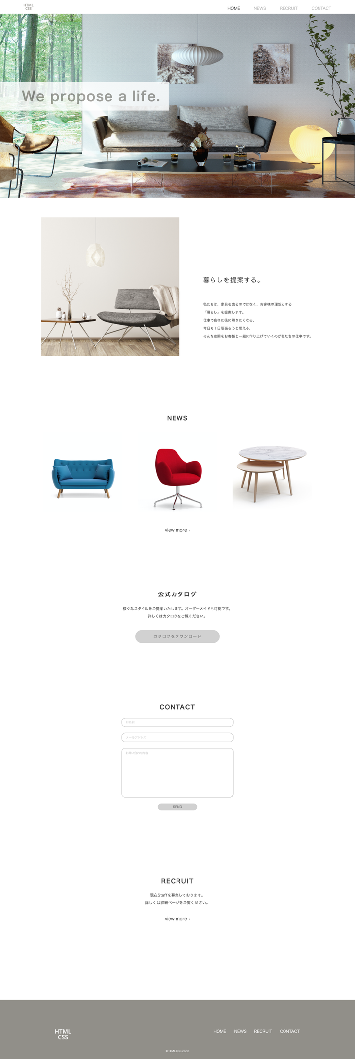 ー学習内容ー LP制作: XDのデザインに基づき、HTMLによる正確なマークアップとCSSによるデザインの実装、JavaScriptによる簡易的なアニメーションの実装。