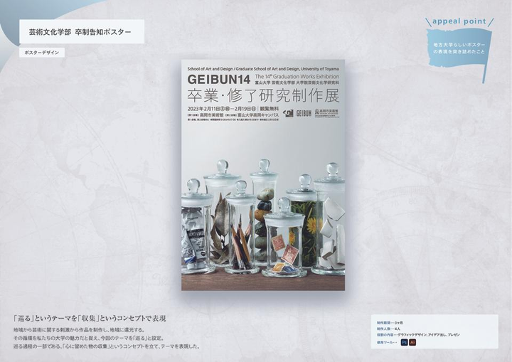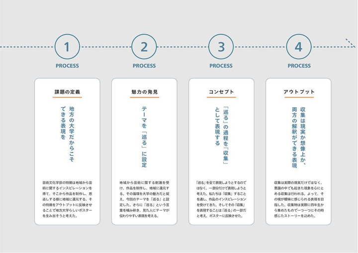 「巡る」というテーマを「収集」というコンセプトで表現。 地域から芸術に関する刺激から作品を制作し、地域に還元する。その循環を私たちの大学の魅力だと捉え、今回のテーマを「巡る」と設定。巡る過程の一部である、「心に留めた物の収集」というコンセプトを立て、テーマを表現した。