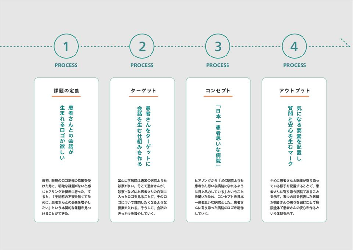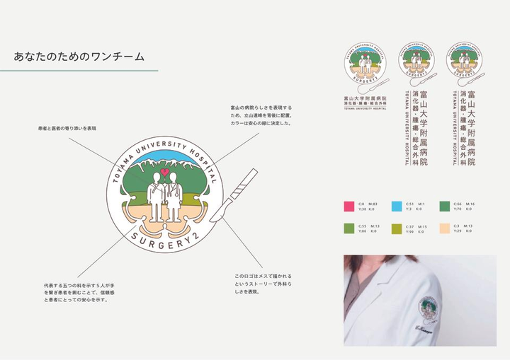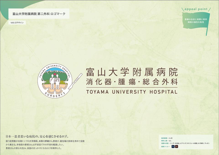 日本一患者思いな病院の、安心を感じさせるロゴ。扱う症例数が北陸トップの大学病院。末期の膵臓がん患者が、最先端の技術を求めて全国 から集まる。手術前の患者さんは不安定でその不安を軽減したい。患者さんの安心を生み、会話のきっかけになるロゴを制作した。
