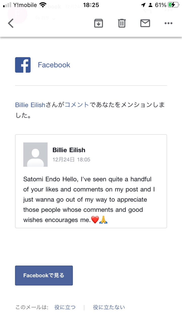 2021年の12月24日にアメリカのミュージシャンです。YouTubeの動画に一億の視聴回数のビリーアイリッシュさんのファンになりこの日の前から、Instagramの全てにいいねしたあと、コメントしてFacebookにもいいねしてたら、ご本人かマネージャーさんから私にメールが届きました。 それからずっと感謝してます。 コメント欄に誰かから怒りマークが届いたから、悪いことだと勘違いし、 びっくりし過ぎて、保存するつもりが間違えて削除押してしまい申し訳ないのとミスして削除してとても残念でしたが、Gmailに残っていたから、スクショしました。まだ残っていて良かったです。