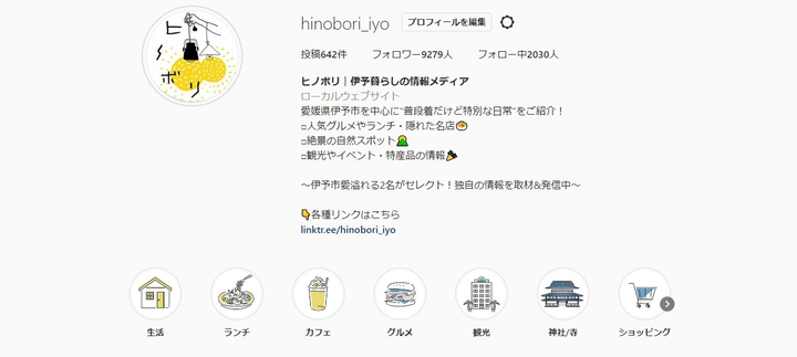 広報活動の一環として地域の情報発信を行うInstagramアカウント「伊予暮らしの情報メディア ヒノボリ」を立ち上げ、運営して今に至ります。フォロワー数は19,000人超えていますが、フォロワー数よりエンゲージメントの高いアカウント運用を心掛けています。