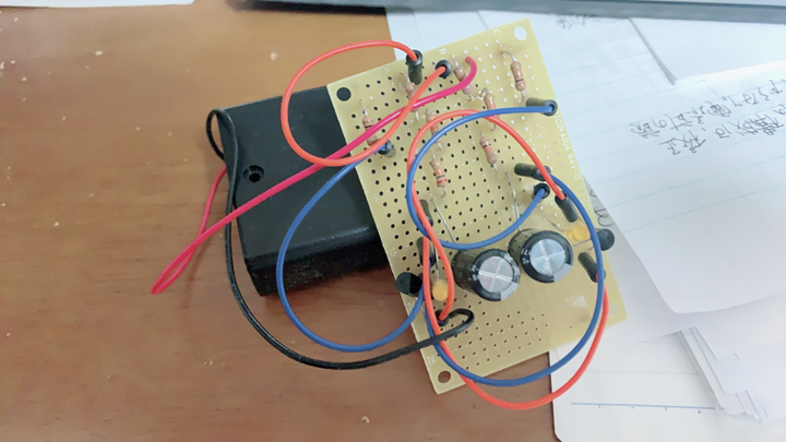回路図から理論値を計算し、抵抗、コンデンサ、LED(視覚化のため)を購入し作成した。