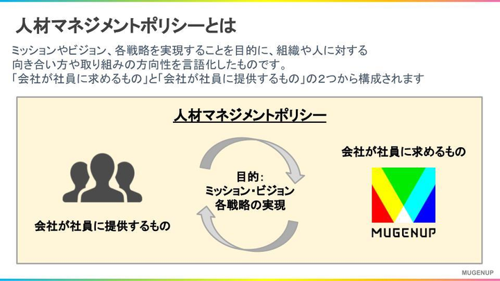 ソーシャルゲーム市場の拡大の最中に創業し、市場の成長と共に事業拡大をしてきた弊社ですが、直近、AI技術の台頭により、今のままだとAIに代替され得るリスクが高まってきた背景を鑑み、ビジョンに掲げる「総合デジタルコンテンツメーカー」への成長を遂げるべく、事業変革を推進。 人事制度も会社の変革に合わせ刷新していくべきと考え、1人1人異なるバックグラウンドを持つ社員でも、共通認識を持てる、具体的な行動レベルの指針を目指し、「人材マネジメントポリシー = 会社と社員の約束事」を作成しました。