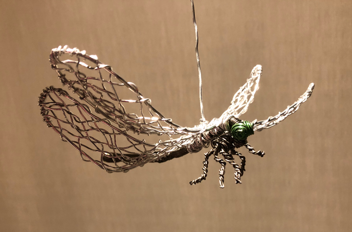 針金の太さを使い分け、トンボの羽の模様は三つ編みを3つほど組み合わせて編みました。