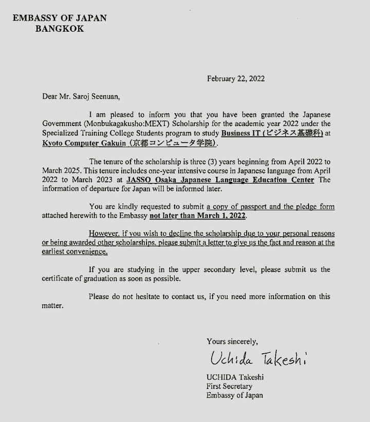タイのサイパンヤーランシット高等学校を卒業後、文部科学省の奨学金を獲得し、国費留学生として日本に来る機会を得ました。これは私の人生にとって非常に大きな一歩であり、異国の地での生活や学びを通じて大きく成長することができました。日本語の壁を克服し、文化や価値観に順応する中で、京都コンピュータ学院でITビジネスを学んでいます。2025年3月には卒業を予定しています。 現在までに、HTML、JavaScript、CSS、JQuery、Ajax、Bootstrap、Node.js、Java、React、VB.Netといったプログラミング言語や技術に精通しています。また、日本語能力試験(JLPT)N1を取得し、日本語でのコミュニケーションにも自信を持っています。 日本では、2023年に日本運通(Nippon Express)でITインターンシップを経験し、ASUSTOR NASシステムを使用した開発環境のセットアップに携わりました。この経験を通じて、技術的なスキルはもちろん、チームとの協力やプロジェクト管理の重要性も深く理解しました。