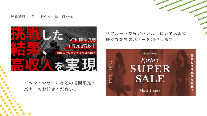 Figam、XDを用いて、バナーからHP、LPのデザインのお仕事に携わっています。 (下記ポートフォリオに制作実績と簡単な経歴を掲載させていただいております)