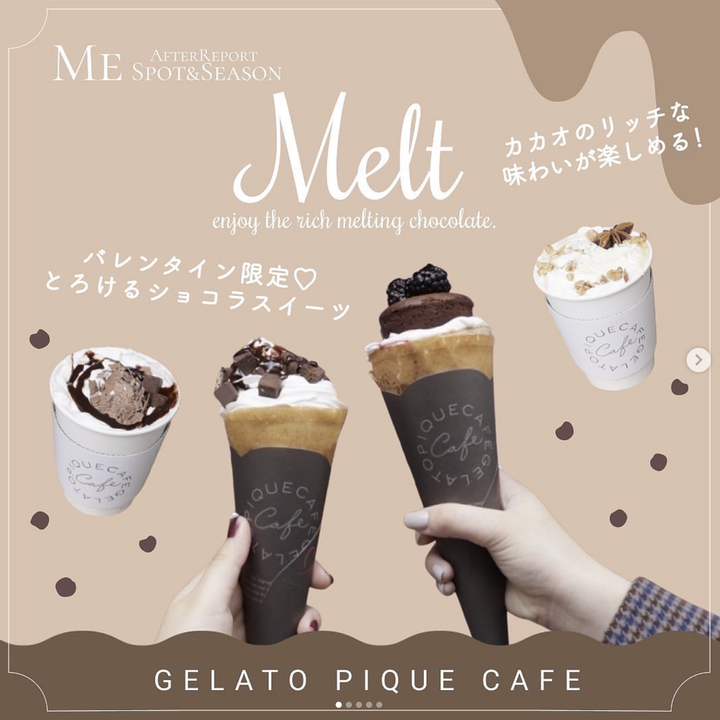グーグルトレンドで「ジェラートピケカフェ」の検索件数が上昇傾向にあり、価格もターゲット層に合っていることからジェラートピケカフェのフェアスイーツの紹介投稿を制作しました。 撮影から画像制作までを行い、特に画像に関してはスイーツのイメージを損なわないカラー、背景にチョコチップをモチーフにした模様をあしらうなど心がています。