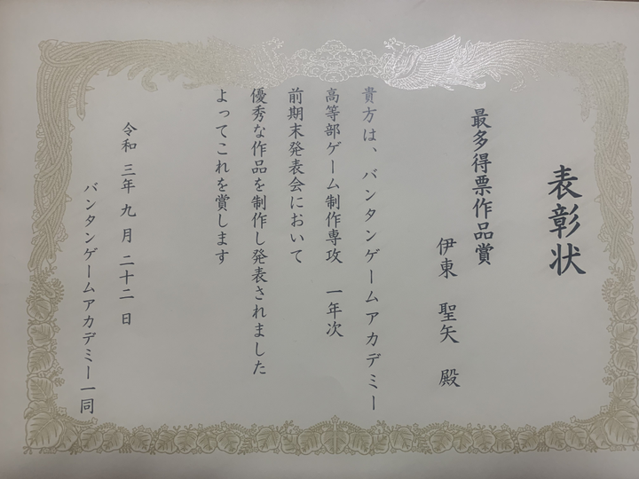 FPSゲームで1年次 前期末発表会 最多得票作品賞を受賞しました