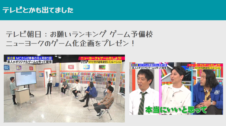 テレビ朝日バラエティー番組「お願いランキング, お願いゲーム予備校にてお笑い芸人「ニューヨーク」のゲーム化企画をプレゼンしました