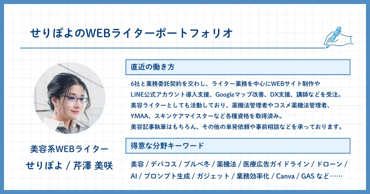 薬機法や医療広告ガイドラインなどに対応可能な美容ライターの芹澤 美咲(せりざわ みさき)と申します。