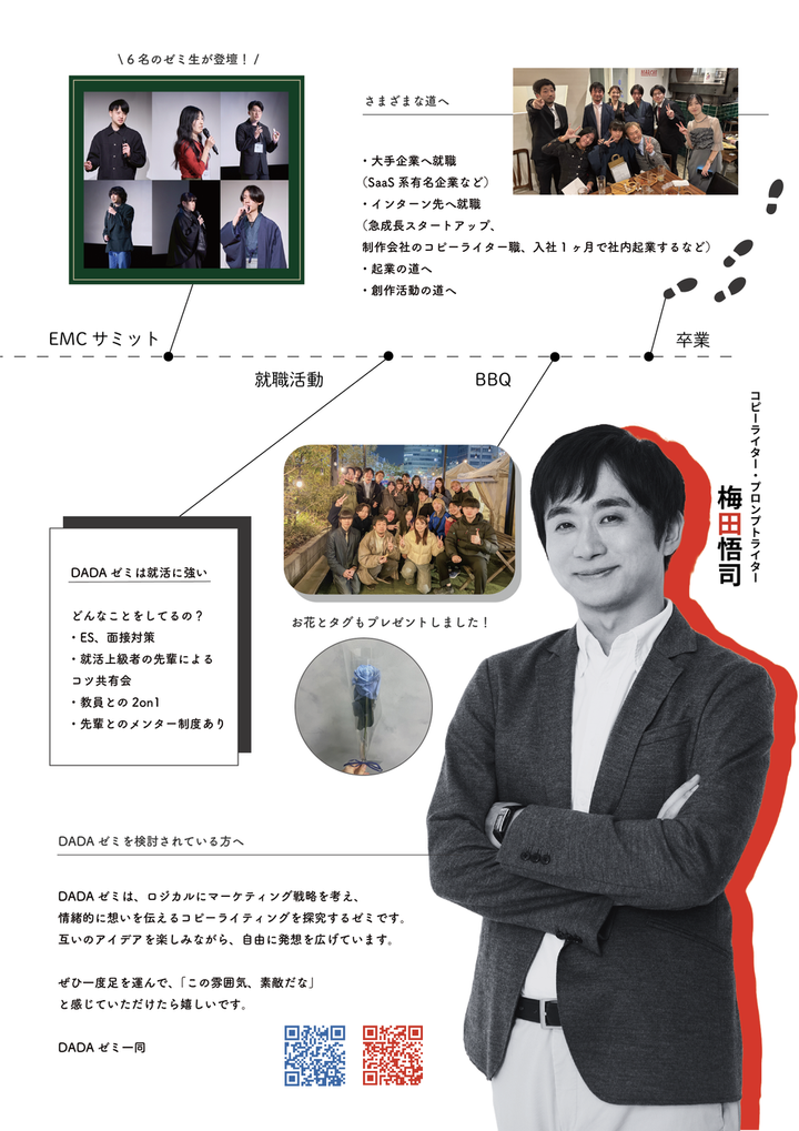 【梅田・寺田ゼミとは】 マーケティング・コピーライティングを中心に学びます。 ゼミ生や外部の方の事業や悩みや困っていることを一緒にんがえます。寄り添い思いやり、面白がるゼミです。 【学んだこと】 ・マーケティング戦略 ・コピーライティング