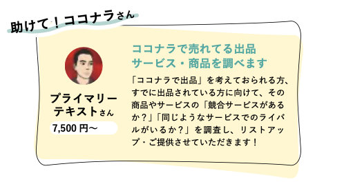 クラウドソーシングサイト「ココナラ」に、競合調査を行うサービスを出品。 2024年4月発行の初の公式ガイド本『ココナラ START BOOK』にこのサービスが掲載されました。