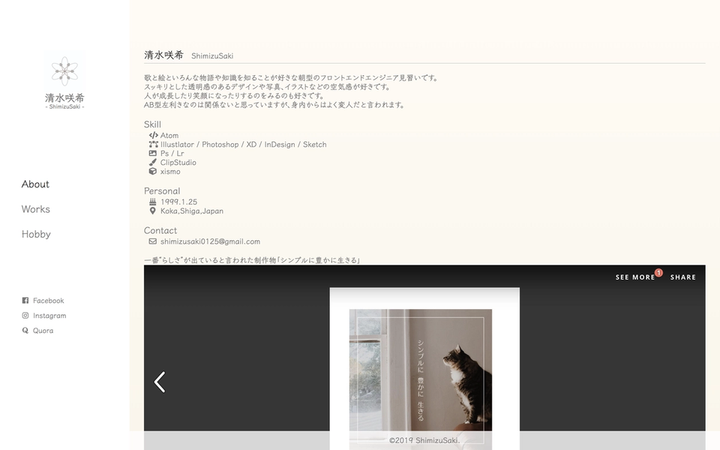 ※現在は学校サーバー閉鎖により閲覧できません 専門学校2回生の頃作ったサイト。 2018~2019年にかけて日々更新しつつ制作を進めていきました。 作品の絞り込み機能を付けるのに悪戦苦闘しながら作っていたことを覚えています。 今見てみると足りていないところも沢山ありますが、気に入っています。