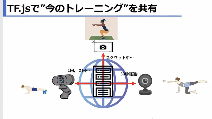 2dayハッカソンにてオンラインで共同して筋トレをし、その状況をシェアするアプリを開発しました。運動強度や運動時間を基に部屋を割り当て、自身が運動しているか、休憩しているかを機械学習による姿勢推定を用いて共有するアプリです。