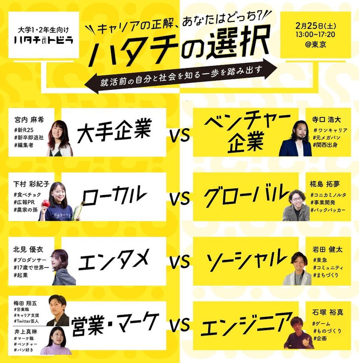 スタートラインが曖昧な“就活”を見据え、「どんなキャリアを選択することが正解?」 サークル、バイト、インターン、就活準備…「将来の選択肢を踏まえ、大学生活でどんな経験をすることが正解?」 ハタチの選択は、インターンや就活を前に自分の軸を考えるイベントです。 大手 vs ベンチャー グローバル vs ローカル ソーシャル vs エンタメ 営業 vs マーケ vs エンジニア 「自分だったら、何を選ぶか?」を思い描きながら聴く、ロールモデルによるトークセッションと、同世代とちょっと真面目に語るワークショップを通じて、自分の未来について考えるイベント。