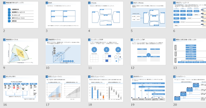 経営企画や起業、事業経営責任者、MBAを経験してきており数千枚ものスライド作成をしてきました。今まで培ってきた経験を元に、事業計画立案のティップスをテンプレート化しました。 ■事業計画のティップス ・外部環境フレームワーク ・経営戦略 ・マーケティング ・会計 ・シミュレーション ・意思決定ツリー