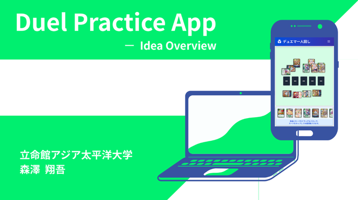 Duel Practice App - アイデア資料(Idea Overview) このアプリは、ただのカード操作ツールではありません。 紙の印刷、スリーブの準備、場所の制約、そんなアナログの不便さを越えて、「今すぐ、どこでも、自由に」デッキを試せる思考の実験場を目指しました。 操作はシンプルに、体験は直感的に。 ドラッグ&ドロップやカード画像アップロードを通じて、まるで本物のカードに触れているような感覚を再現しています。 そして気づけば、それは一人で黙々と試すだけでなく、 友達との懐かしいつながりや、新しい遊び方を自然に生み出す空間へと広がっていました。 この資料では、そんな想いと背景、試行錯誤の過程を、デザインや機能の観点から整理しています。