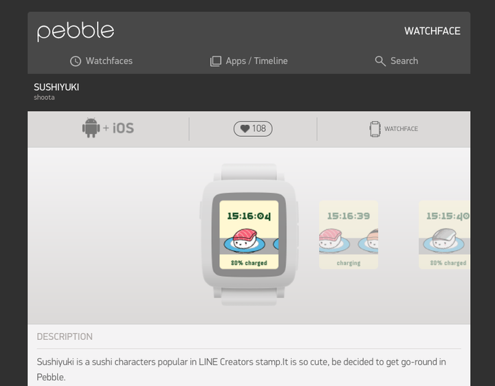 スマートウォッチPebbleの文字盤(Watchface)。 1秒ごとに🍣 が流れます。