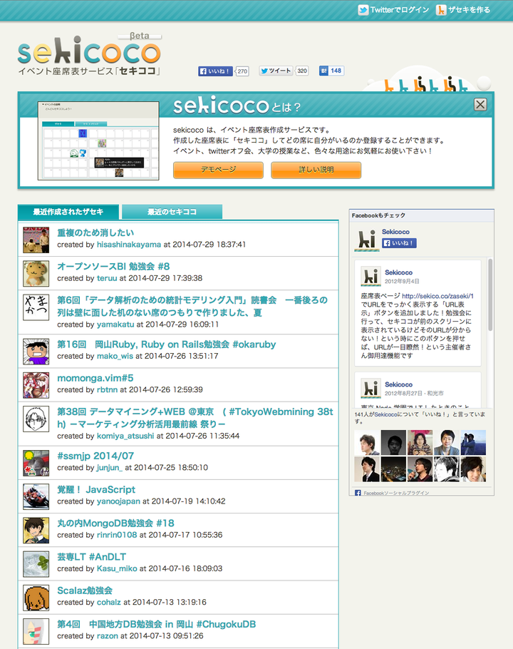 勉強会などのイベント用に座席表を作って、そこに自分の席を登録できるWebサービス。座席ページはWebsocketを使って通信しており、席の登録情報やコメントはリアルタイムに更新される。ビジュアルデザインを知り合いのデザイナさんに手伝っていただいた。