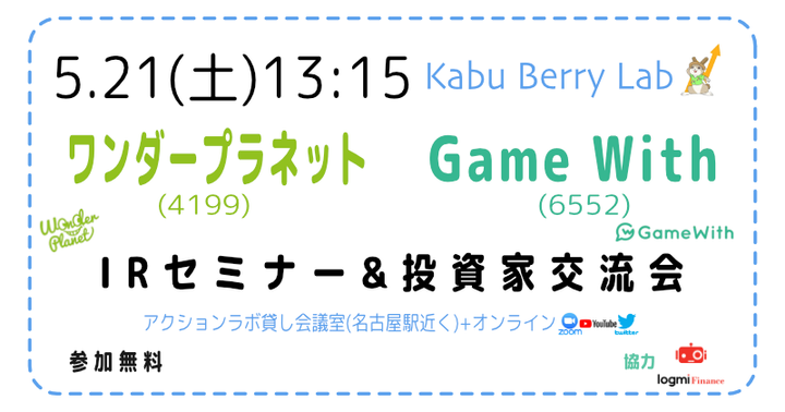 日時:2022年5月21日(土)13:15~ ・オフライン会場; 愛知県名古屋市中村区名駅南1丁目19-27 オルバースビルディング名古屋 ・オンライン; https://kabuberry.com/lab47/#yykk 参加費:無料 名古屋市のおいて、個人投資家の方を中心とした投資家の皆様にGameWithの事業の魅力や成長性などを直接お伝えできればと思います。 「ジャンプチ ヒーローズ」や「クラッシュフィーバー」などの企画・開発・運営を行うワンダープラネット社(グロース・4199)と同時登壇のイベントとなります。
