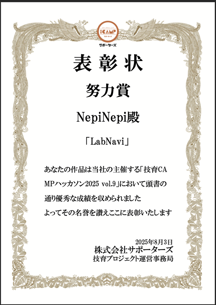 即席の5人チームで2週間ほどかけてアプリを開発するハッカソンに挑戦し、努力賞を獲得した。3回生が多かったこともあり、研究室情報を分かりやすく見ることができるアプリが必要だと考え、LabNaviを実装した。主観で捉え方が変わるような情報は載せないように、載せる情報は客観的な数値(受賞歴、研究内容など)を載せるようにすることを心がけた。また、レーダーチャートや口コミ投稿機能などを実装した。 ミーティングの前に話す内容を文字に起こすことでできるだけ短い時間で終わらせたり、React初心者が多かったので、メンバー間のイメージ共有も兼ねてまずGeminiにプロトタイプを作らせるなどをして、短期間、即席チームでも成果を出せるようにした。