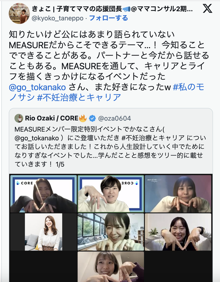 クローズドなコミュニティならではのテーマ「不妊治療」のイベントを企画。 内部メンバーの需要を把握した上でイベント企画をし、この人だという登壇者をフォロワーさんから引っ張ってきました!