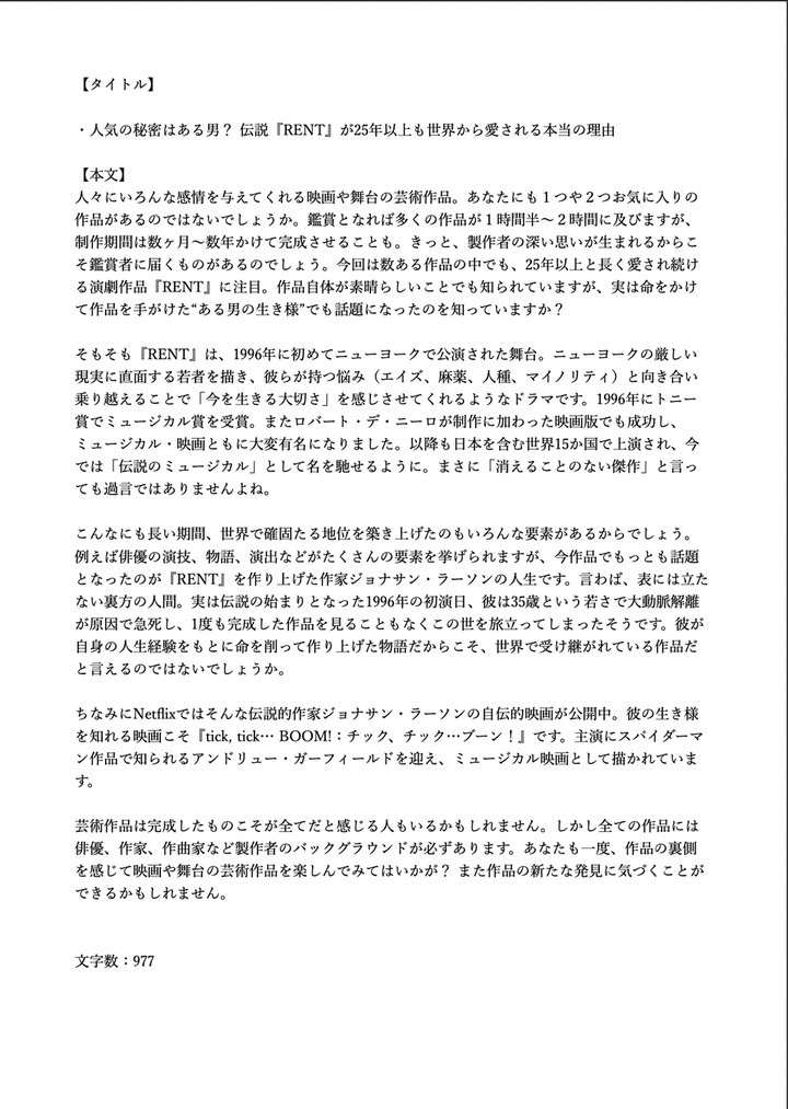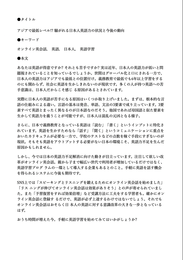 ライターとしての独立を目指し、企業様(秘密保持契約で名前非公開)とコンテンツライターとして業務委託契約をさせていただきました。そこでライターとしての研修後、様々なジャンル(映画、話題の動画、アニメ、保険関係、英語など)を執筆。