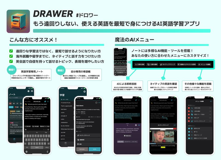 英会話や英語日記のためのノートアプリ。 英語,韓国語,中国語など15ヶ国語に対応。