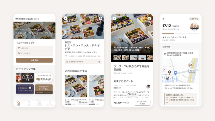 タクシーデリバリーアプリ「GO Dine」の立ち上げからデザインを担当しました。 「GO Dine」は、お客様にコロナ禍でも記念日など特別な日であれば、おいしい料理と一緒にご自宅で安心して過ごしてほしいという思いと、コロナで打撃を受けたレストランやパティスリーを少しでも助けられればと始まったサービスです。タクシーでのお届けは接触を抑えられ、タクシードライバーによって丁寧な運搬とサポートが可能です。 「GO Dine」が通常のデリバリーサービスと違う点は「配達にタクシーを使っていること」。タクシー側にもユーザー側にも、コミュニケーションのズレが生じないように、タクシーの停め場所や受取方法の指定、お届け当日はアプリでタクシーの現在地や到着予定時刻の表示するなど、体験設計にこだわっています。