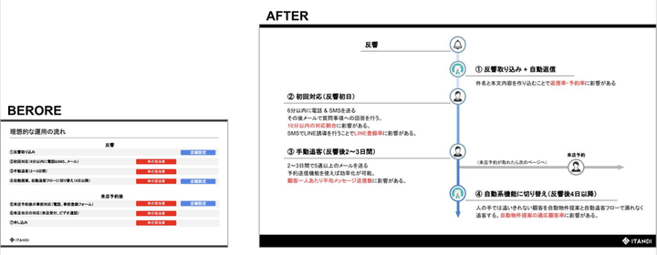 リデザイン後の資料を用いてオンボーディングさせたクライアントは既存資料を使ったクライアントと比べて、サクセス度合いを図る重要指標6つのうち5つの平均値を向上させることができました。(対象:既存資料→18社、新資料20社) SaaSシステムのCSにおいて重要なポイントのひとつに「いかにスムーズなオンボーディングを提供できるか」というものがあると思います。 マーケ→IS→FS→CSと繋がれてきた流れの中で躓くことなくアダプションさせていく。 そしてイタンジではCSとして最初のクライアントタッチポイントが「サクセスレクチャー」と呼ばれるものでした。 自社に溜まったデータ的なノウハウなどを実際の機能やクライアントの営業スキームに組み込んでもらうことで最速でサクセスしてもらいたい!との意図があります。 しかし我々が伝えたいこととクライアントの知りたいことにギャップが生じていたり、伝えたいことのボリュームや濃度が濃すぎて情報過多になってしまっている(オンボーディング段階のクライアントにとっては)状態を感じていました。 そこでレクチャー時に使用する資料の刷新を行いスリム化させました。