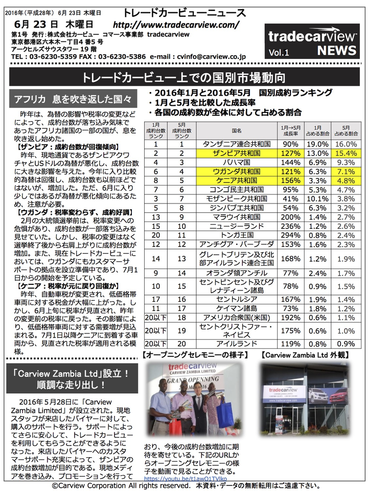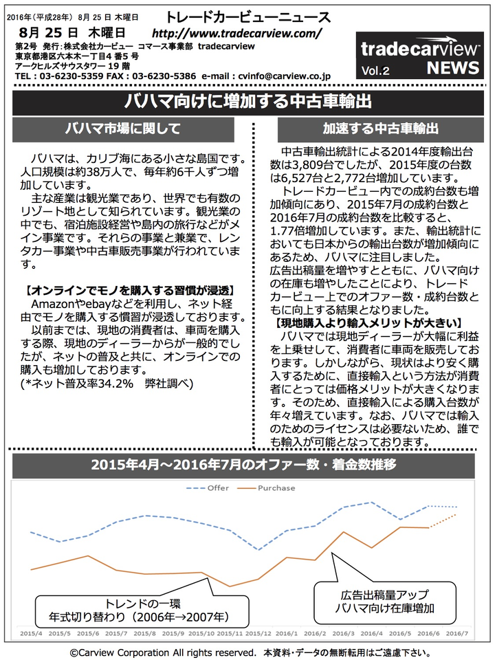 国内の法人輸出業者・個人事業主向けに、変動の激しい海外の市場動向を記事としてまとめサービスに加盟している約1,000の業者の方に定期的に配信しました。また、車を仕入れるためのオークション会場であるJAA・HAAにも配布され約5,000の業者の方に配布することができました。