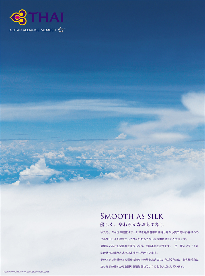 About Thai Airway's hospitality which providing from the bottom of their hearts, they convey the desire of our passengers to have a comfortable trip, so I express it with a wonderful view of the air travel. In order to promote the image of the company, convey the company's philosophy and message. I used to express the Thai Airways International Service by offers a wonderful view while boarding and gently provides Thai hospitality likely to a soft cloud in the blue sky. タイのおもてなしを心底提供しつつ、ご搭乗のお客様が快適な旅を過ごさせたい思いを伝えて素敵な空旅の景色を見せて表現します。 企業のイメージを訴求するため、企業の理念やメッセージなどを伝えます。 搭乗中の素敵な景色を見せて、青い空にやわらかな雲のようなタイのおもてなしを優しく提供しているタイ国際航空サービスを表現します。