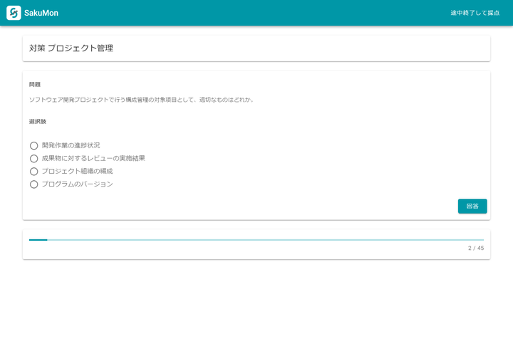 新卒時の就職活動用ポートフォリオとして作成しました。 ユーザー投稿型問題集サービスです。 個人での開発作品になります。 リポジトリ: https://github.com/suzukey/portfolio-sakumon ## アピールポイント ・Rails、Nuxt.js、Kubernetesなど使ったことのなかった技術に積極的に挑戦した点 ・友人に使ってもらい、実際にフィードバックをもらいながら開発している点 ## 作成を行った背景 専門学校に通っていた際、資格対策などで問題集のプリントなどが配られることが多く、「いつでもどこでも問題を解けるようにしたい」というアイデアから問題集を静的に登録し、何度も反復することができるWebサイトを作成しました。 70人近くいたクラスメイトに向けて公開したところ、大変好評で問題プリントをもらうたびにJsonファイルを1人で追加しておりました。 その経験から「簡単に問題を投稿して公開できるようにしたい。誰でも投稿出来たらいいな。」と思い、このWebサービスを開発しました。 実際に試験の前などに使ってもらい、リアルなフィードバックをもとに様々な改善を行うことができました。 当初はEC2の上にminikubeを乗せ、CloudFrontを通して動かしていましたが現在はCloudRun上で動作しています。