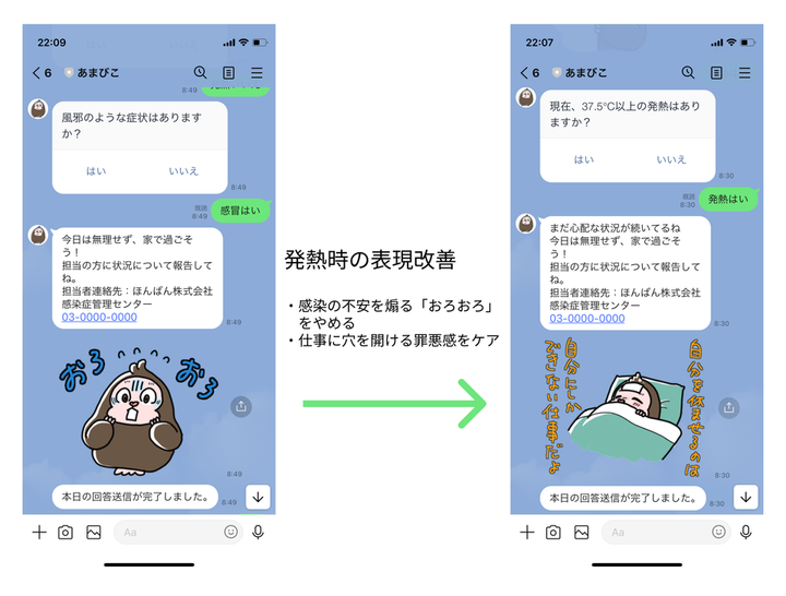 【概要】 コロナ禍が始まった2020年に、LINEで体調報告できるサービスAMAVICOを開発。(現在はサービス終了) 出勤前や登校前に体温をLINEで報告することで、従来の紙運用と比較して利便性が高いとして、複数の医療施設や大学で導入された。 【課題やコンセプト】 ・2020年にコロナ禍が始まり、感染管理が必要になった。 ・学校や医療現場を中心に、毎日熱を測って管理者に連絡する作業が必要となったが、紙での運用をしており、手間がかかることや衛生面に課題があった。 ・導入組織のメンバー全員が利用できるツールである必要がある。 【制作期間】 1~2ヶ月 【制作ツール】 ClipStudio 【担当領域】 アートディレクション UXライティング 品質管理 仕様改善 【制作体制】 エンジニア 2人 医療監修 1人 CS 3人 アートディレクター 1人 【工夫した点】 ファーストリリースでは、機能を最優先にライティングしたが、安定運用後に心理面の改善も取り組んだ。 本来の機能としての感染管理のみではあるが、当時は医療崩壊や感染者への差別も多く、そんな不安な気持ちにも寄り添えるサービスでありたいと思った。 そこで、発熱報告時の文言に着目。それまでは発熱の報告をするとオロオロしているキャラクターを表示させていたが、不安を増長させている可能性があると考えた。 感染に対する不安と、仕事に穴を開けることの罪悪感の両方をケアしたいと考え、「自分を休ませるのは自分にしかできない仕事だよ」という表現に変更した。 感染の秘匿が減ったなどの定量的な変化は見られなかったが、利用している方からこの表現についてポジティブなコメントをいただくことができた。