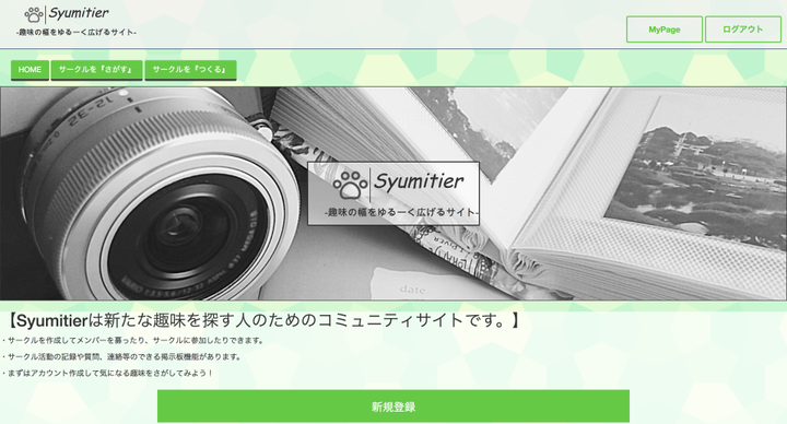GitHub: https://github.com/tabata1993/syumitier Ruby on railsを用いて、社会人向けのサークルメンバー募集サイトを作成。 コンセプト:趣味の幅を広めることを目的に、気楽に参加・退会できるようにした。