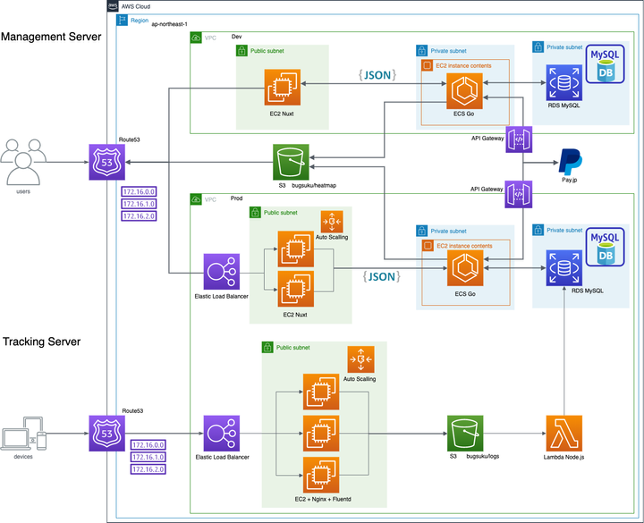 <概要> Webサイト上にタグを埋め込むことで、ユーザーの動きをログとして取得し、 管理画面上で動画として再生することができるサービス <技術スタック> ・開発言語 1. 管理画面 フロントエンド:Nuxt.js サーバーサイド:Go(gin) 2. データベース MySQL 3. 計測 Node.js Lua、Fluentd(計測サーバー) ・CI Circle CI ・サーバー AWS ネットワーク:VPC ドメイン管理:Route53 管理画面フロント:EC2(ロードバランサー ) 管理画面サーバー:ECS(Fargate) 計測タグ:S3 計測サーバー:EC2(Auto Scaling) ストレージ:S3 メールサーバー:SES 監視:Cloud Watch 今後、サーバーサイドのマイクロサービス化を進めるため Lambdaの導入等行いたい。