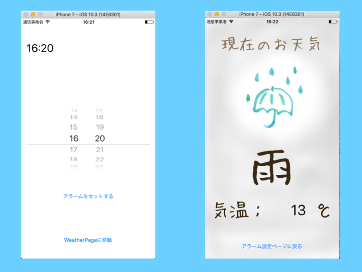 夜の睡眠、または日中の仮眠などから眼を覚ます際に、アラームアプリを用いるだろう。しかし、アラーム音は不快である印象である。また、朝は忙しいために天気のニュースなどを見ることができず、傘の持って行き忘れなどが生じてしまうため、朝起きることに用するアラーム音を天気の情報にしたアプリケーション。「朝アラームで起きる」+「天気を知る」を同時に行う。画像は株式会社マンハッタンコードさんの画像をお借りしています。 Swift3で作成。